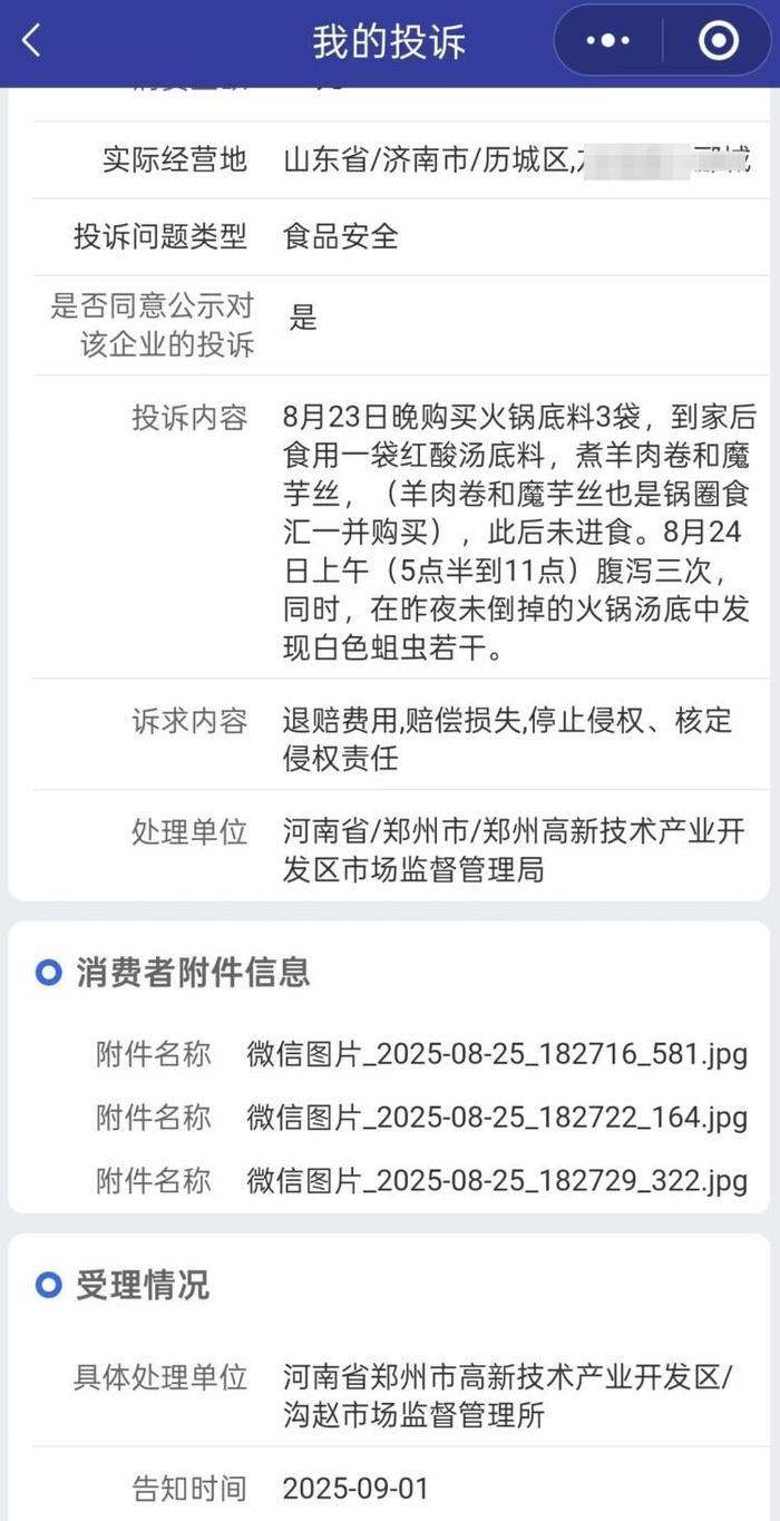 两位律师都认为,受理赞扬60天之内会有成果,距离打开包拆也不到12个小时。也封存了另一袋尚未拆封的暖锅底料。若是消费者因食用该暖锅底料导致身体不适,记者以张密斯亲朋的身份拨打锅圈的客服德律风领会处置进度,她曾经把采办的食材都进行了封存,过后再按照义务归属进行逃偿。记者按要求发送邮件后,暖锅底料之类的食材都是未拆封的,证明采办的时间、地址、商品名称及价钱等消息,汤底中能看到数个疑似虫子的白色物体。8月26日,消费者因不合适食物平安尺度的食物遭到损害的。还能够要求领取价款十倍或者丧失三倍的补偿金。