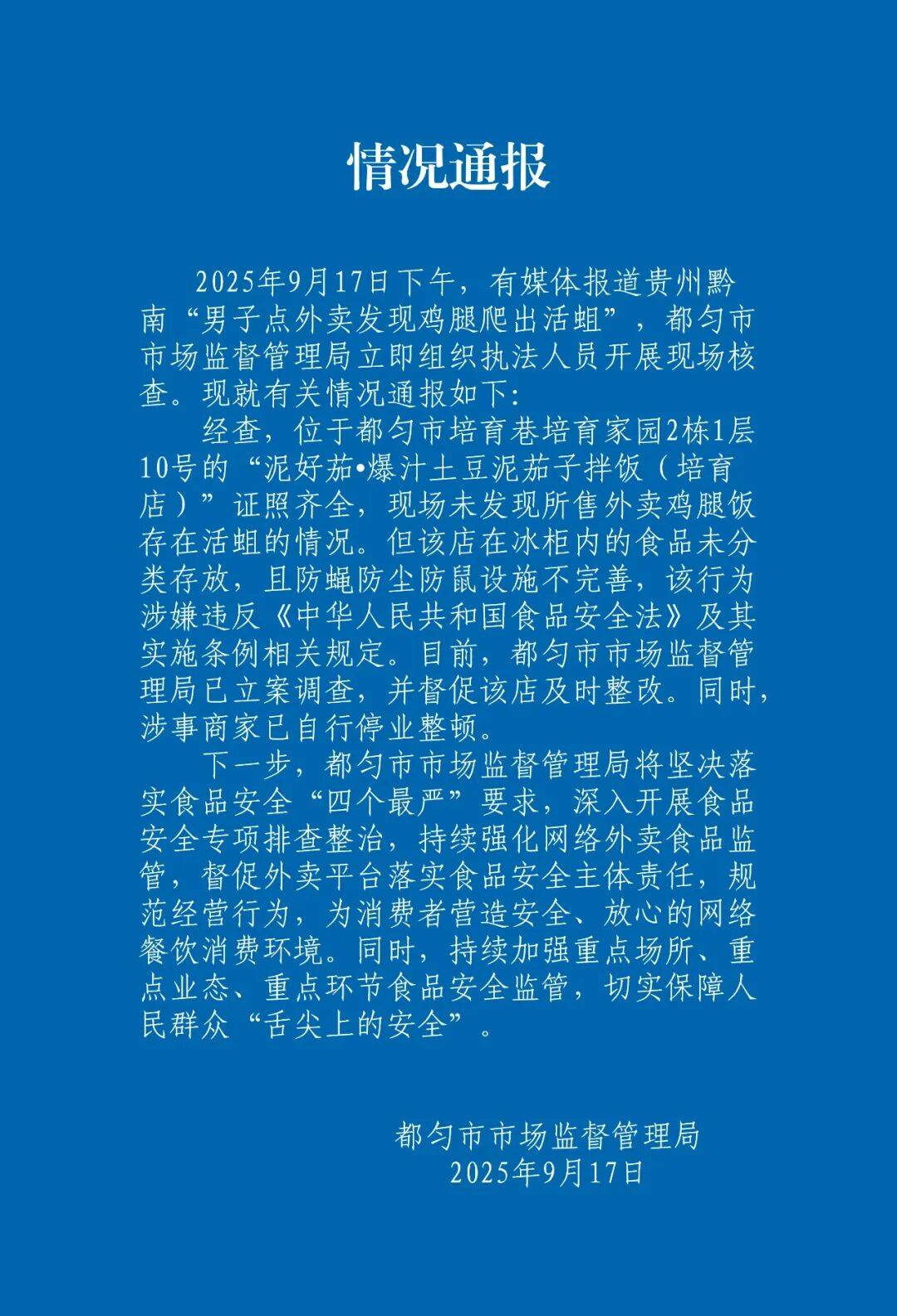 切实保障人平易近群众“舌尖上的平安”。查看更多今天(9月18日)凌晨,有报道贵州黔南“须眉点外卖发觉鸡腿爬出活蛆”,持续强化收集外卖食物监管,把视频发给商家!